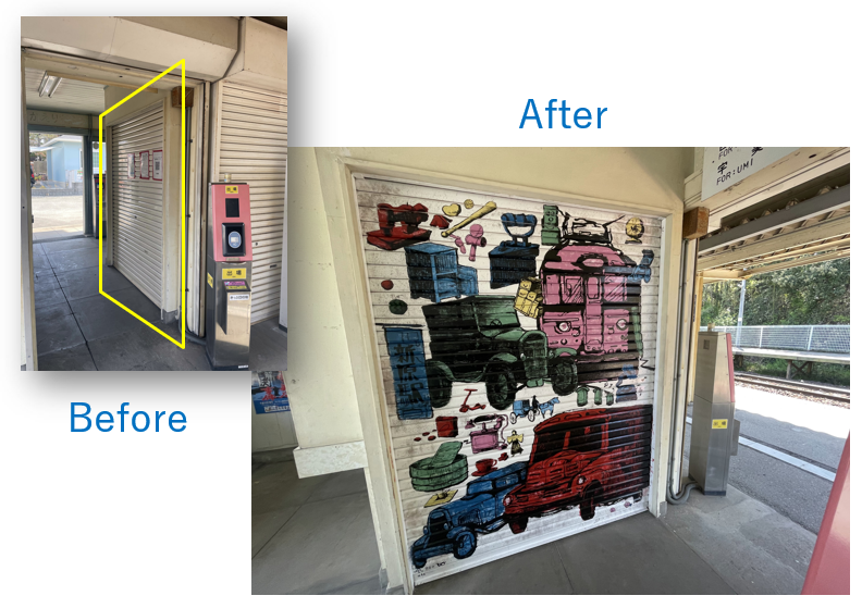 JR香椎線「新原駅」:駅窓口シャッターペイント